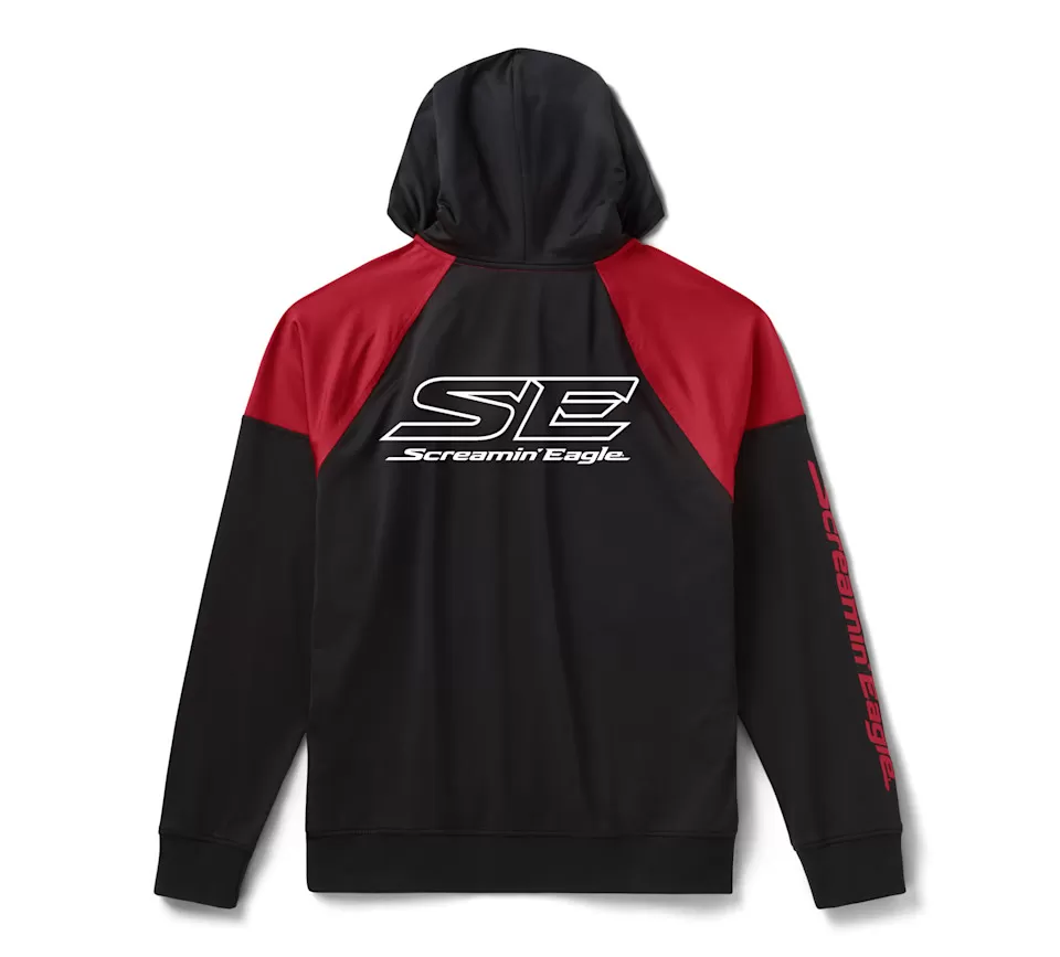 Throw on a layer of bold, race-loving style with our Screamin' Eagle® Color Blocked Hoodie. Made cozy from a brushed cotton/polyester jersey blend with a hit of spandex for added stretch. Its thermal lined hood delivers a textured look (zoon in to see), plus features a double eyelet to tuck away the drawstring so it won’t flap around under your riding gear. This men’s zip hoodie is boldly finished with colorblock styling and graphics that cheer on our winning factory team legacy.