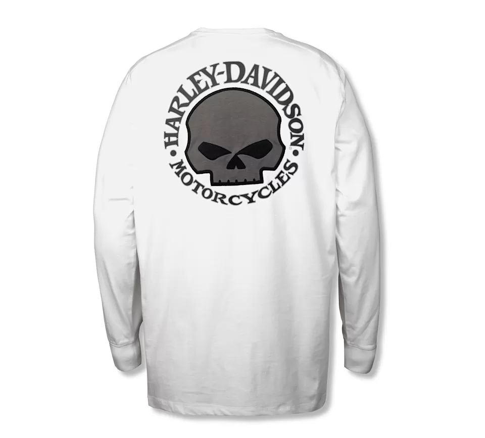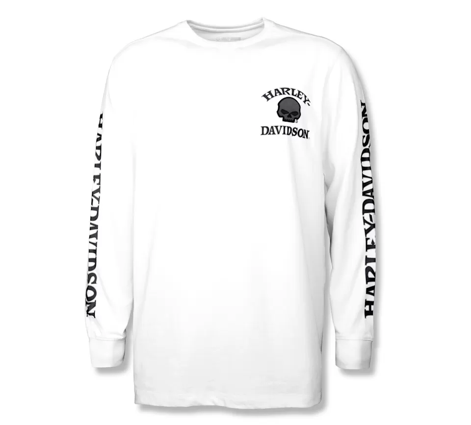 Comfortable, bold, legendary…The Willie G™ Skull Long Sleeve Tee is all three. It’s made from super soft cotton jersey in a relaxed fit with a rib-knit neck and cuffs to help keep its shape. This men’s long sleeve t-shirt showcases the fearless Willie G Skull plus our namesake riding tandem down the sleeves. Know the history—though the Skull is one of his most popular creations, Willie G. Davidson also designed several motorcycles, including the 1971 FX Super Glide® and the 1977 FXS Low Rider®.