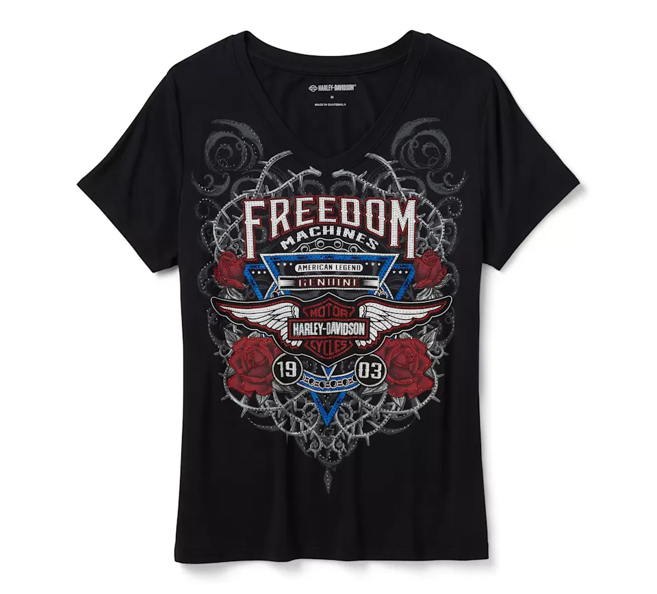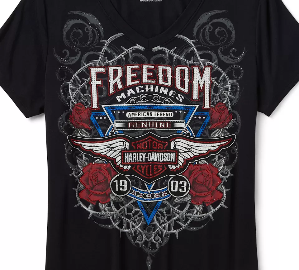 Keep your bold style and open-road spirit authentic in our Bling Highway Rider Short Sleeve V Neck. Made for longwearing comfort from heavyweight rayon jersey with spandex for added stretch, this women’s t-shirt is designed with a flattering V-neckline. It’s finished with rhinestone-kissed graphics that fuse mechanical grit with artistic flair for a freedom-loving look to honor our moto legacy. Order yours before it’s too late.