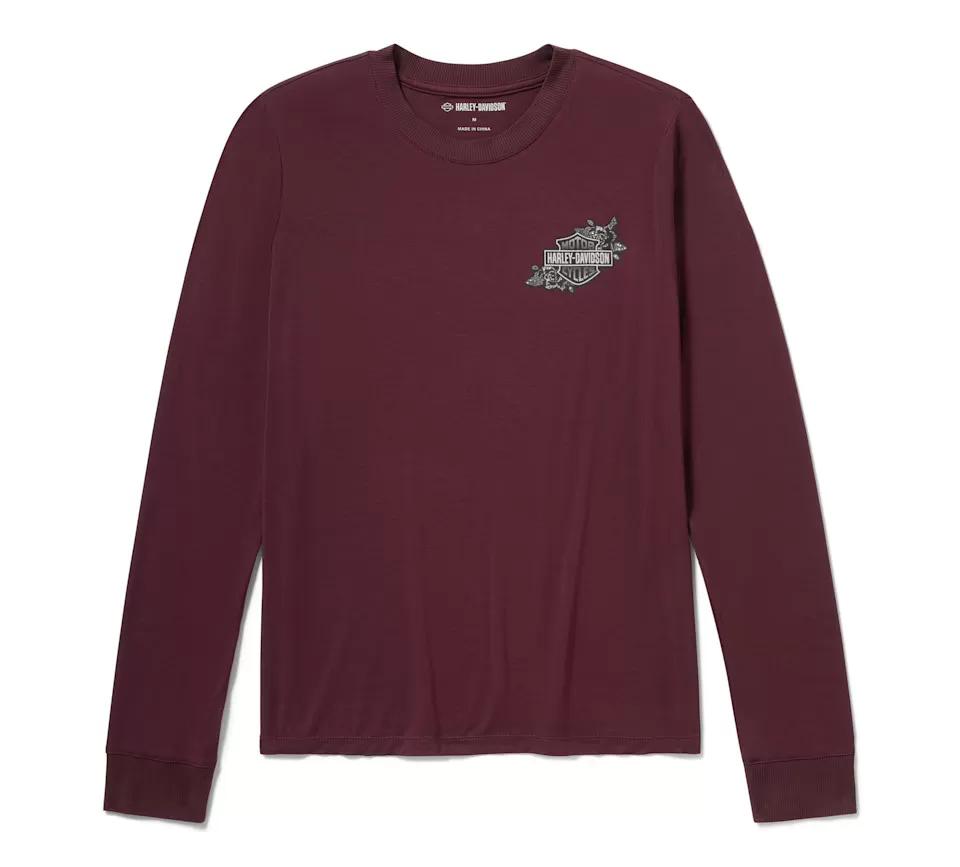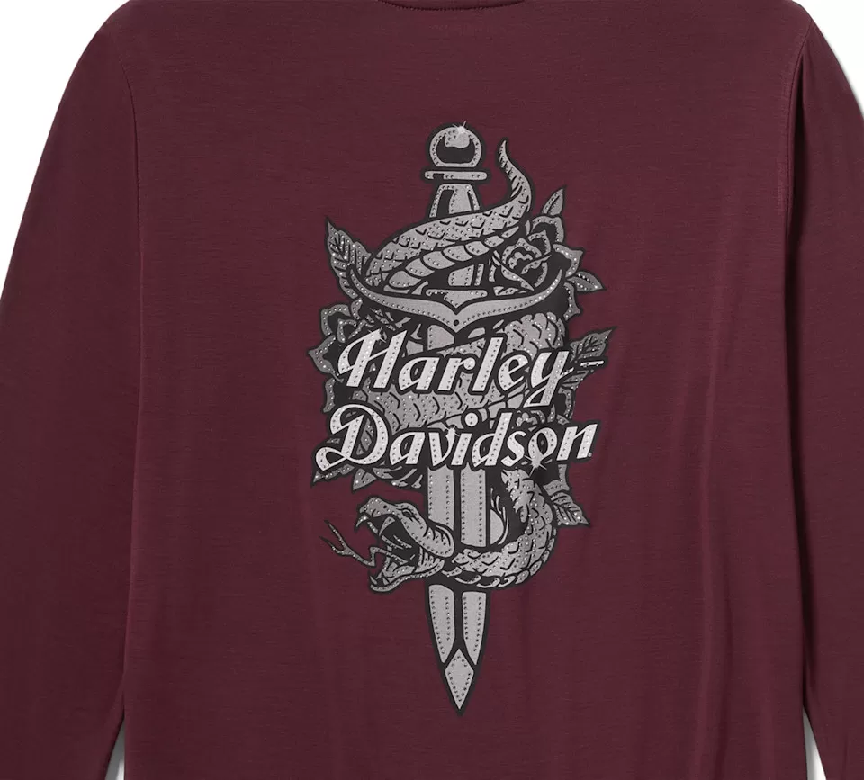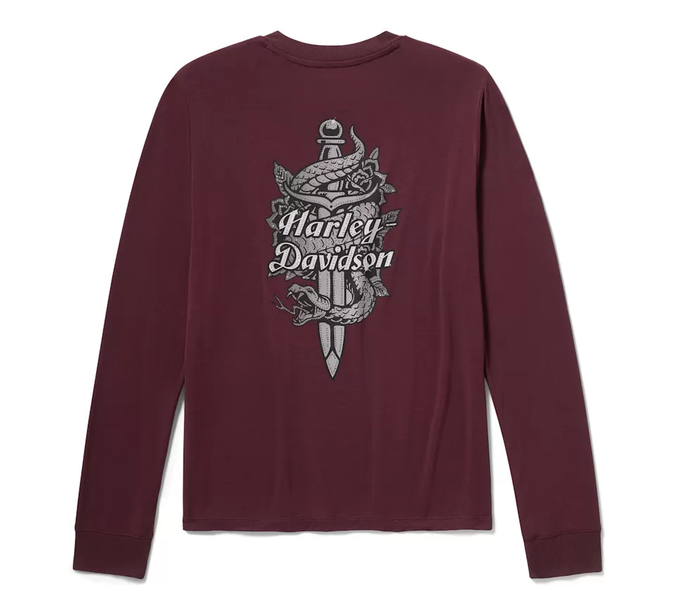 Be stunning with an edge in our Serpent Rose Bling Top. This women’s long sleeve is made for longwearing comfort from super soft rayon jersey with a hint of spandex for added stretch. It’s strikingly finished with a front floral hit plus a reptile, rose, and dagger design on back that’s all drenched in rhinestones.