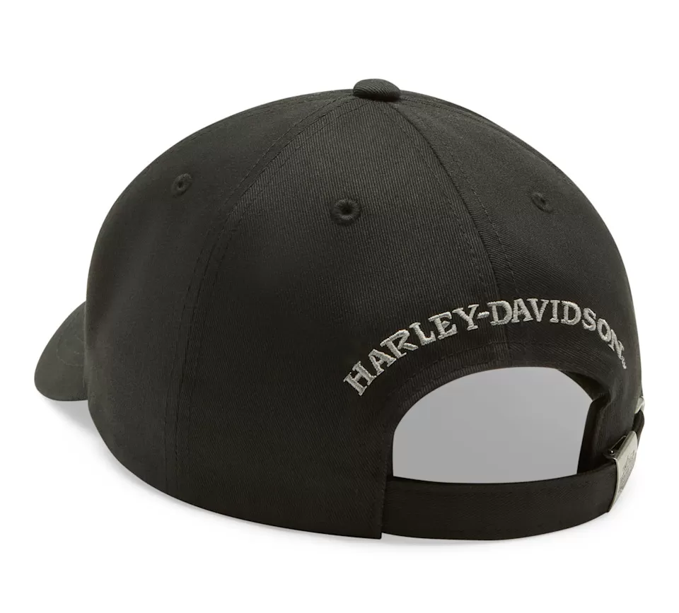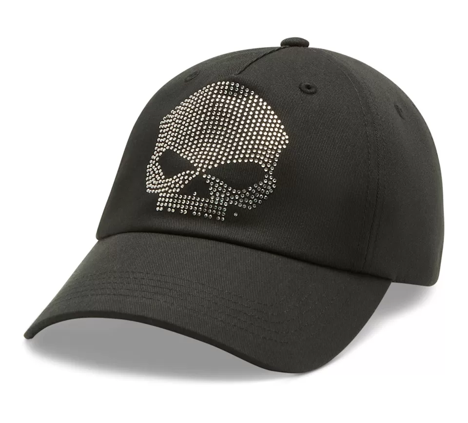 Your shimmering moto style starts up top in our Willie G™ Bling Skull Ballcap. Made breathable and rugged from all-cotton twill, this women’s hat has an adjustable metal slider for your ideal fit. It features the iconic Willie G Skull in rhinestones on front and an embroidered hit of our namesake on back. Know the history—though the Skull is one of his most popular creations, Willie G. Davidson also designed several motorcycles, including the 1971 FX Super Glide® model and the 1977 FXS Low Rider® model.