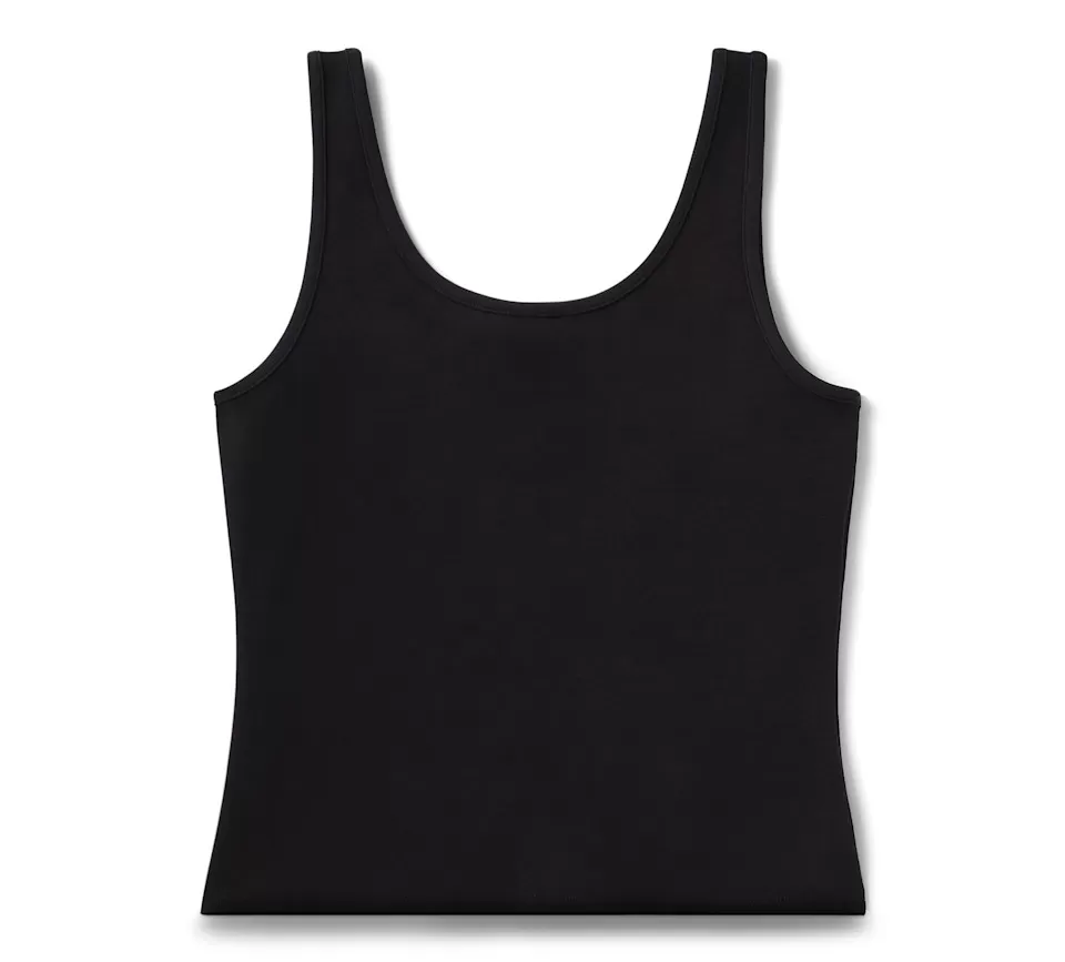 Design Details: Front notched neckline. Back scooped neckline. Self-bound neckline and armholes. Straight hem. Shorter length.