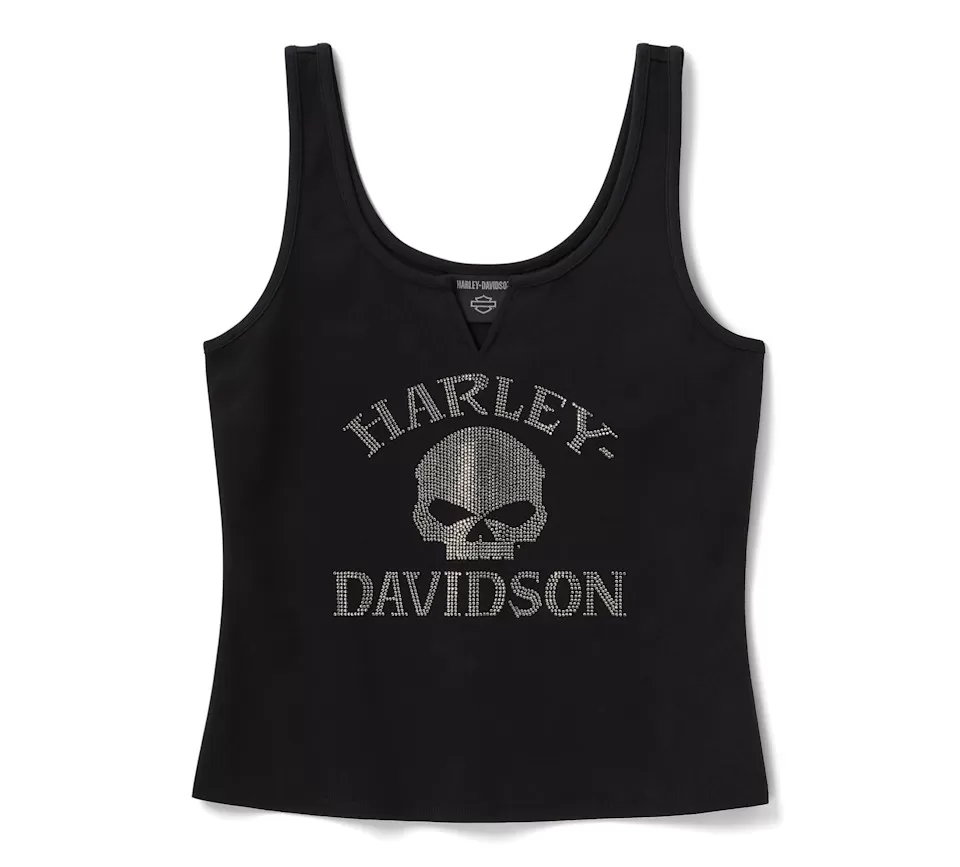 Level up your stay-cool look in the Willie G™ Skull Bling Tank. It’s crafted from breathable cotton interlock with a hit of spandex for added stretch in a shorter length silhouette. This women’s tank top has a flattering front notched neckline and back scooped neckline, plus shimmering rhinestone graphics parked on front. Bit of background—though the Skull showcased here is one of his most popular creations, Willie G. Davidson also designed several motorcycles, including the 1971 FX Super Glide® model and the 1977 FXS Low Rider® model.